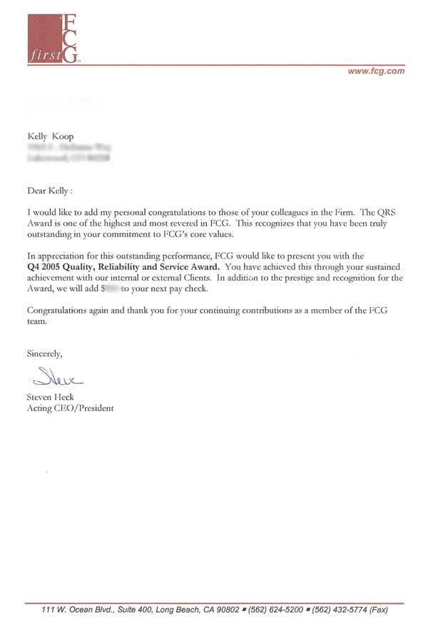 Each Quarter at FCG, the employees nominate a peer for the QRS Award.